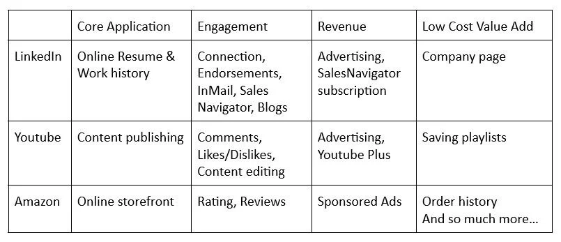 Platform features all fall into one or more of these categories: core application, user engagement, revenue generation, or value adding for the user with very little R&D investment by the platform owner. All of these should create value for the community on the platform.